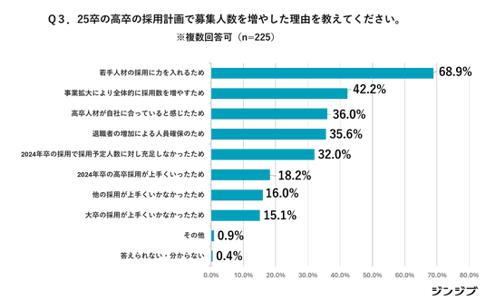 次いで、「業績向上による事業拡大のため」(42.2%)、「高卒人材が自社に合っていると感じたため」(36.0%)、「退職者の増加による人員確保のため」(35.6%)が続き、事業拡大や退職者による人材不足への対応が背景にあると考えられます。