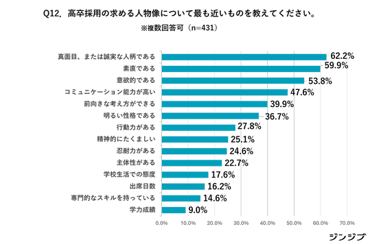 高卒採用での求める人物像で回答が最も多かったのは、「真面目、または誠実な人柄である」(62.2%)でした。次いで「素直である」(59.9%)、「意欲的である」(53.8%)が続き、人柄や姿勢を重視する傾向が明確に見られます。