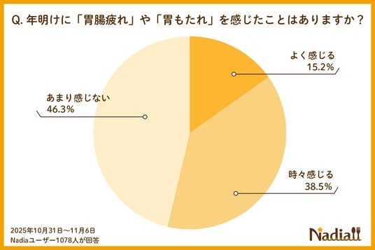 続いて、ご馳走が続く年末年始を経て胃腸疲れや胃もたれを感じたことがあるかという質問では、「よく感じる」(15.2%)、「時々感じる」(38.5%)が合わせて合計53.7%となり、2人に1人が経験したことがあるという結果に。