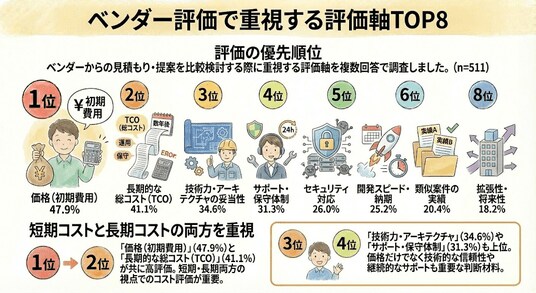 ベンダー評価で重視する評価軸として、「価格(初期費用)」(47.9%)がトップ。同時に「長期的な総コスト(TCO)」(41.1%)も高い割合を示し、短期・長期両面でのコスト評価が重視されていることが判明しました。