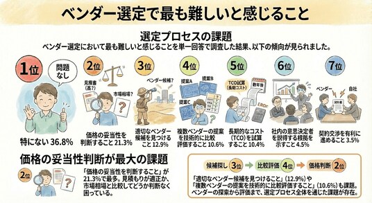 ベンダー選定において最も難しいと感じることは「価格の妥当性を判断すること」(21.3%)でした。ベンダーから提示された見積もりが適正かどうか、市場相場との比較が難しいという課題が浮き彫りとなっています。