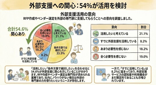 また、「すでに外部支援を活用している」企業が8.2%に留まる一方で、潜在的な関心が54%以上という結果は、外部支援サービスの認知度や利用機会がまだ限定的であることを示唆しています。適切なサービスを選択できれば、多くの企業がRFP作成・ベンダー選定のプロセスを効率化し、システム導入の成功確率を高められる可能性があります。
