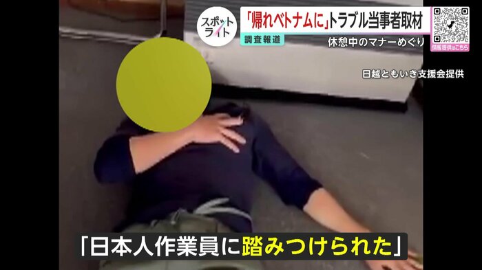 動画には映っていないが、ベトナム人の男性が日本人作業員に「踏みつけられた」と訴える会話が記録されている。