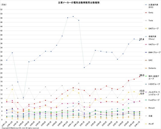 マークラインズ株式会社(本社:東京都港区、代表取締役社長:酒井 誠、http://www.marklines.com/) は、電気自動車の世界販売の約90%をカバーする主要15カ国を対象にグローバル市場における電気自動車の台数情報及び販売動向を分析した2025年11月の電気自動車(BEV/PHV/FCV)販売月報(商用車を除く、推計値を含む)を掲載しました。