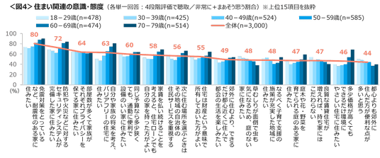 「免震対策をとっているなど、耐震性のある家に住みたい」は80%、「防犯や火災などに対するセキュリティシステムが完備した家に住みたい」72%がTOP2。次いで「部屋数が多くて家族がそれぞれプライバシーを保てる家に住みたい」「自分や家族の将来を考え、バリアフリーの住宅に住みたい」「同じ予算なら多少狭くても、通勤に便利で設備のいい家に住みたい」が6割台。多くの項目は年代が高くなるほど割合は増えるが、「草むしりが面倒で虫も気になるため、庭のない家に住みたい」「良質な賃貸住宅が増えれば、持ち家にはこだわらない」のみ年代が若いほど高い。<図4>