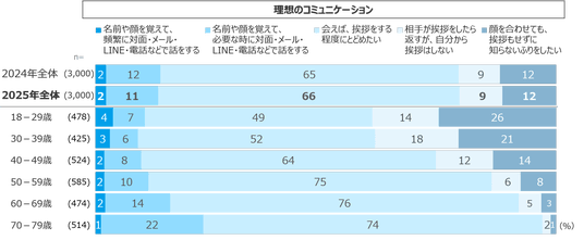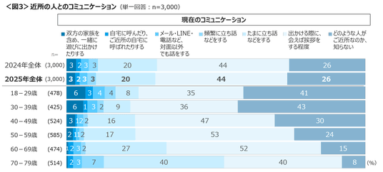 近所の人とは「出かける際に、会えば挨拶をする程度」44%、「どのような人がご近所なのか、知らない」26%であった。18~29歳、30代は「知らない」がボリュームゾーンで4割を占める。70代は「たまに立ち話などをする」「会えば挨拶をする」が4割とコミュニケーションは密である。理想は「会えば、挨拶をする程度にとどめたい」が66%と最多。18~29歳と30代は「顔を合わせても、挨拶もせずに知らないふりをしたい」が2割台と近所とのコミュニケーションには内向的。<図3>