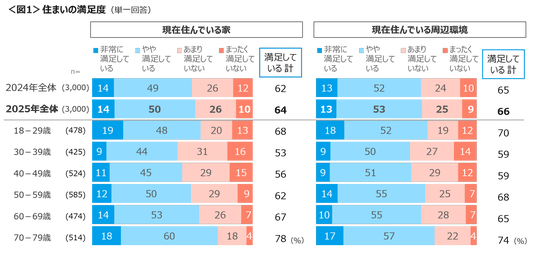 現在住んでいる家に対しては、非常に+やや満足しているは64%、周辺環境は66%。家と周辺環境ともに30~40代は5割台にとどまり、70代は7割を超える。<図1>