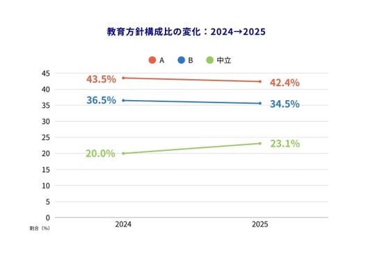 - 教育方針(A:みんなができることをしっかり身につけさせたい/B:うちの子の得意・個性を伸ばしたい)は、 どちらかに決めきれず、「どちらともいえない」と回答する層が一定数存在した。その割合は前年より増加した(前年差:+3.1pt)。