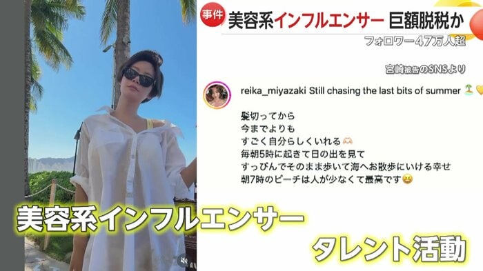 美容系インフルエンサーでタレントの宮崎麗果被告(37)が、法人税など約1億5700万円を脱税した疑いで東京地検特捜部に在宅起訴された。宮崎被告はSNSで47万人超のフォロワーを持ち、複数の美容関連会社を経営。架空取引を装い約5億円の所得を隠したとされる。本人は「過少申告を重く受け止め、修正申告と納税に対応する」とコメントした。