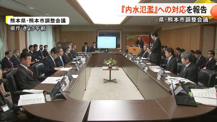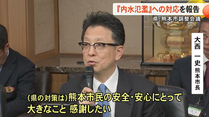 熊本市は排水機場の耐水化や止水板設置補助制度の導入など市の対策を説明し、大西一史熊本市長は「(県の対策は)熊本市民の安全・安心にとって大きなこと。感謝したい。出水期までにスピーディーにお願いしたい」と述べた。