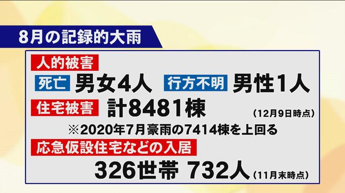 最初は2025年8月の記録的大雨について、県内では4人が亡くなり、1人の行方が分かっていない。また、住宅の被害は8481棟に上り、5年前の7月豪雨の被害件数を上回っている。仮の住まいでの生活を余儀なくされている被災者は、11月末時点で326世帯732人だ。