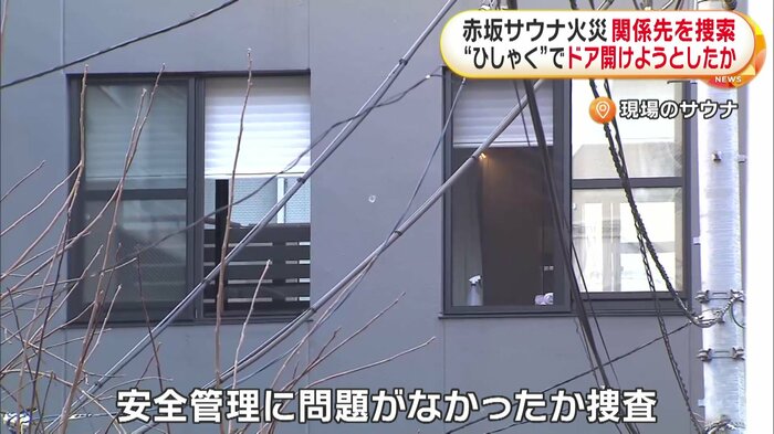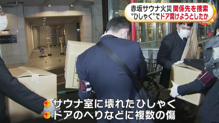 東京・赤坂の個室サウナの火事で死亡した夫婦が、柄杓(ひしゃく)でドアをこじ開けようとしたとみられることが分かった。