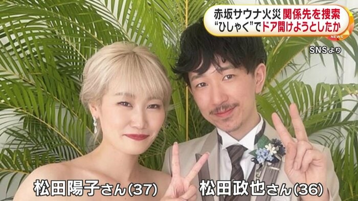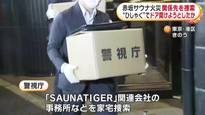 赤坂の個室サウナ「SAUNA TIGER」で12月15日、美容室経営の松田政也さん(36)と妻の陽子さん(37)が死亡した火事で、警視庁は25日、関連会社の事務所などを家宅捜索した。