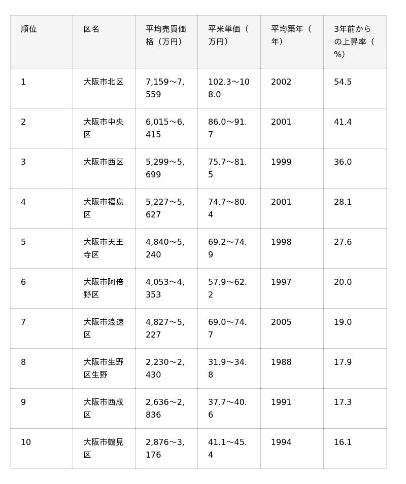 マンションナビ独自のデータより、大阪市内各区3年前からの価格上昇率が高い順にランキング化しました。