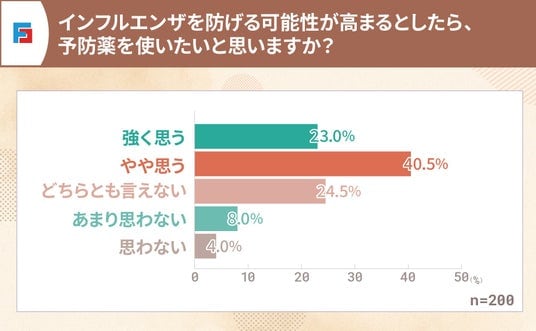 インフルエンザを防げる可能性が高まるとしたら、予防薬を使いたいと思うか聞いたところ、「強く思う(23.0%)」「やや思う(40.5%)」を合わせて63.5%が『使いたい』と前向きな意向を示す結果となりました。