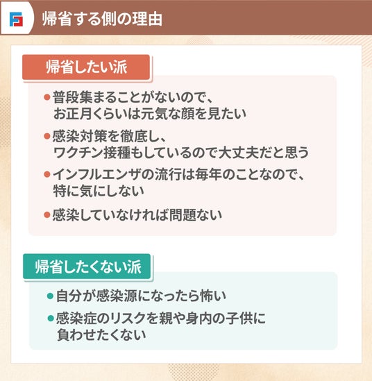 インフルエンザは特に高齢者や基礎疾患を持つ方で重症化しやすいことが知られており、今年の帰省は「重症化リスクの高い家族がいることを前提に検討されているケースが多い」と言えます。