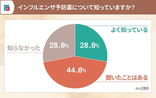 インフルエンザ予防薬について知っているか聞いたところ、「よく知っている(28.0%)」「聞いたことはある(44.0%)」と、合わせて72.0%が何らかの形で認知しているという結果になりました。