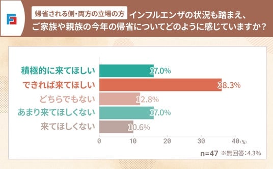 「帰省される側・両方の立場」の人に今年の帰省について聞いたところ、「積極的に来てほしい(17.0%)」と「できれば来てほしい(38.3%)」を合わせて、およそ半数が歓迎する一方で、「あまり来てほしくない(17.0%)」「来てほしくない(10.6%)」と答えた人も3割近くいました。