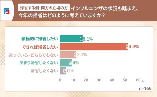 「帰省する側・両方の立場」の人に今年の帰省について聞いたところ、「積極的に帰省したい(18.1%)」「できれば帰省したい(54.4%)」を合わせて約7割が前向きに帰省を希望している一方で、「あまり帰省したくない」「帰省したくない」という消極派も約1割強いる結果となりました。