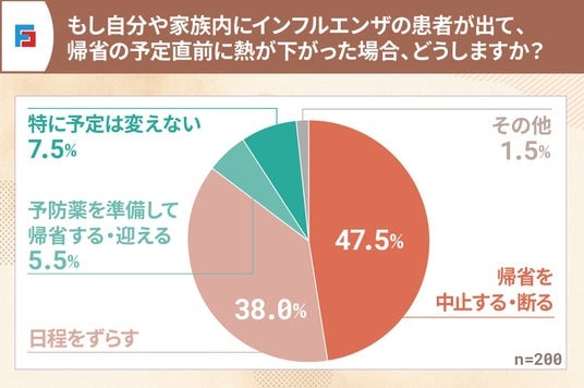 もし自分や家族内にインフルエンザの患者が出て、帰省の予定直前に熱が下がった場合の対応について尋ねたところ、「帰省を中止する・断る」と回答した人が47.5%と、約2人に1人が帰省そのものを見送る結果となりました。