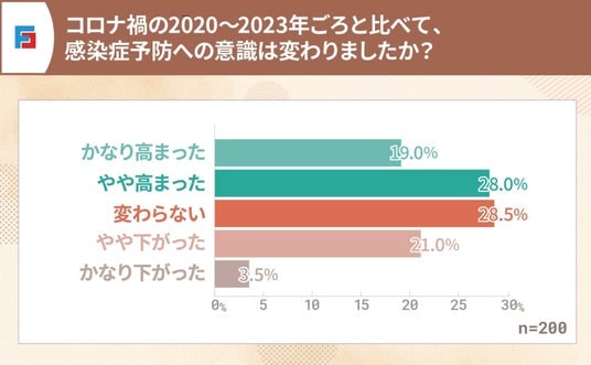 コロナ禍の2020~2023年ごろと比べて、感染症予防への意識がどう変わったかについては、「かなり高まった(19.0%)」「やや高まった(28.0%)」を合わせて47.0%が「意識が高まった」と回答しました。