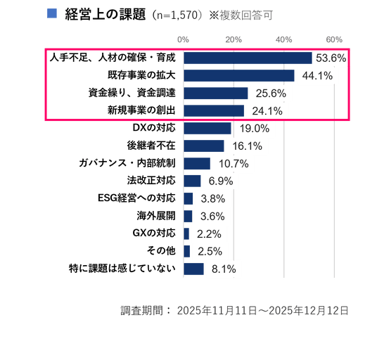 ■「経営 」上の課題で最も多いのは「人手不足、人材の確保・育成」で53.6%経営上の課題について問う設問の回答の中で最も多かったのは「人手不足、人材の確保・育成」(53.6%)で、約6割の経営者が課題として捉えていた。次いで、「既存事業の拡大」(44.1%)が4割を超え、さらに「資金繰り、資金調達」(25.6%)、「新規事業の創出」(24.1%)などが続く結果となった。