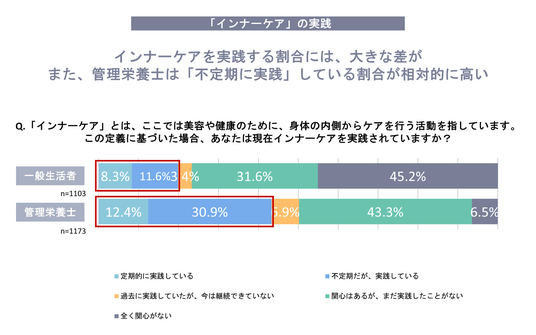 インナーケアを実践する生活者は19.9%、管理栄養士は43.3%。実践率に大きな差