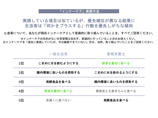 インナーケアとして実践している内容の上位5つには、「こまめな水分補給」「腸内環境に良いものを摂取」「発酵食品を食べる」「野菜を最初に食べる」など、両者で共通点が多くみられる一方で、その順位には違いが見られました。具体的には、管理栄養士が「野菜を先に食べる」という、「いつもの行動を少し見直す工夫」が最も高い一方、生活者は「こまめに水を飲む」「腸内環境に良いものを食べる」「発酵食品を食べる」など、「何かをプラスして取る」ものが上位となる傾向がありました。