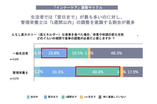 生活者:高カロリーな食事の調整は「翌日までに整える」ことが多く、短期間で調整。管理栄養士:「1週間以内に整える」と答える人が最多で、体調に合わせて長期的に調整。