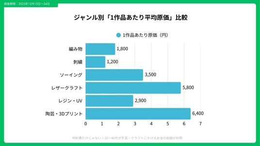 ジャンル別に見ると、初期費用と更新周期に大きな違いが見られました。編み物・刺繍は初期費用が比較的低く平均¥18,000ですが、材料の買い足し頻度は月1.6回。一方、レザークラフトやミシンソーイングは初期費用が¥60,000~¥120,000と高めで、工具更新は2~3年周期でした。