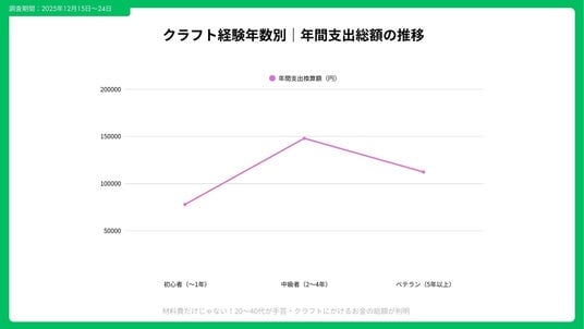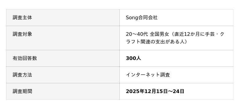 Song合同会社は、直近12か月に手芸・クラフト関連の支出がある20~40代を対象に、年間支出の総額や内訳、ジャンル別のコスト構造、節約・収益化の実態について調査を実施しました。材料費に目が行きがちなクラフト支出ですが、ワークショップや設備、保管費などの「隠れコスト」がどれほど家計に影響しているのかを明らかにしています。