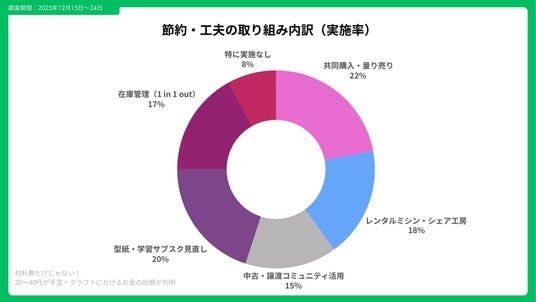 支出を抑える工夫として多かったのは、共同購入や量り売りの活用(実施率22%)、レンタルミシン・シェア工房の利用(18%)でした。特に「1 in 1 out」の在庫管理ルールを導入した層では、年間支出が平均18%削減されています。