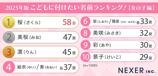 2025年版女の子に付けたい名前ランキングでは、「桜」や「美桜」など自然を連想させる名前が上位を占めました。