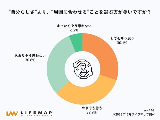 「“自分らしさ”より、“周囲に合わせる”ことを選ぶ方が多いですか?」という問いに対し、63.0%の高校生が「とてもそう思う」「ややそう思う」と回答しました。内訳は、「とてもそう思う」が30.1%、「ややそう思う」が32.9%となっており、自分らしさよりも周囲との関係性を優先する場面が少なくないことがうかがえます。