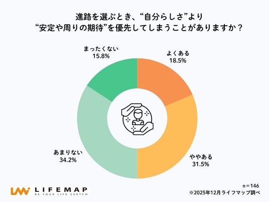 「進路を選ぶとき、“自分らしさ”より“安定や周囲の期待”を優先してしまうことがありますか?」という問いに対し、50.0%の高校生が「よくある」「ややある」と回答しました。内訳は、「よくある」が18.5%、「ややある」が31.5%となっています。
