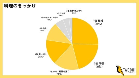 キッチン用品を使用することになるきっかけは「結婚」(323人)、「同棲」(264人)、「引っ越し」(199人)などが高く、料理がライフステージや生活環境の変化に伴って、開始されることを示唆しています。