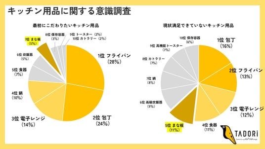 こだわりたいキッチン用品としては、フライパン(478人)と包丁(403人)が突出しており、高い需要があることが分かります。しかしながら「現状満足できていないキッチン用品を見ると、電子レンジ(170人)・食器(166人)に並び、まな板(163人)が上位にあがりました。