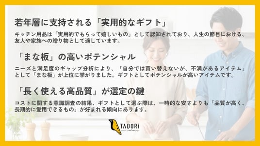 また、若年層を中心に、キッチン用品を「実用的でもらって嬉しいギフト」と捉える意識が高く、人生の節目における友人・家族への贈り物として適していることは明らかです。