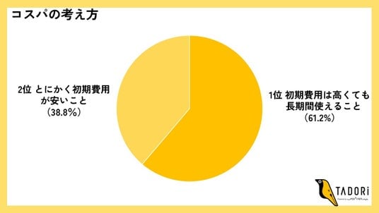 コストに関する意識調査では、「とにかく初期費用が安いこと」(38.8%)よりも、「初期費用が高くても、長期間使えること」(61.2%)を重視する回答が上回りました。近年の物価高騰などの影響もあり若年層は価格の安さよりも、素材の良さや耐久性といった「長く使える価値」を重視する購買意識が高まっていると考えられます。