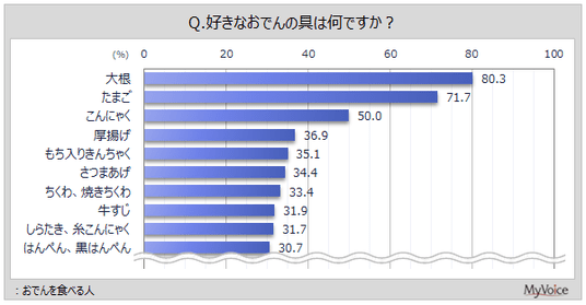 好きなおでんの具は(複数回答)、「大根」がおでんを食べる人の80.3%、「たまご」が71.7%、「こんにゃく」が50.0%で上位3位です。