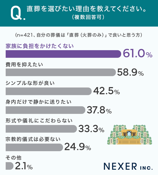 次いで「費用を抑えたい」が58.9%、「シンプルな形が良い」が42.5%、「身内だけで静かに送りたい」が37.8%と続きます。