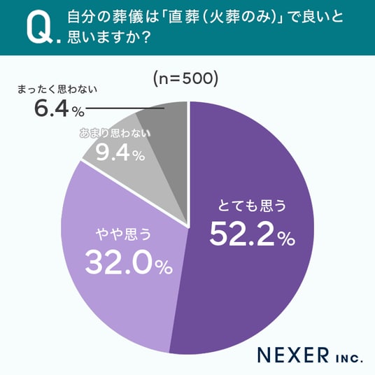 結果は「とても思う」が52.2%、「やや思う」が32.0%となり、合わせて84.2%の人が直葬を希望していることがわかりました。