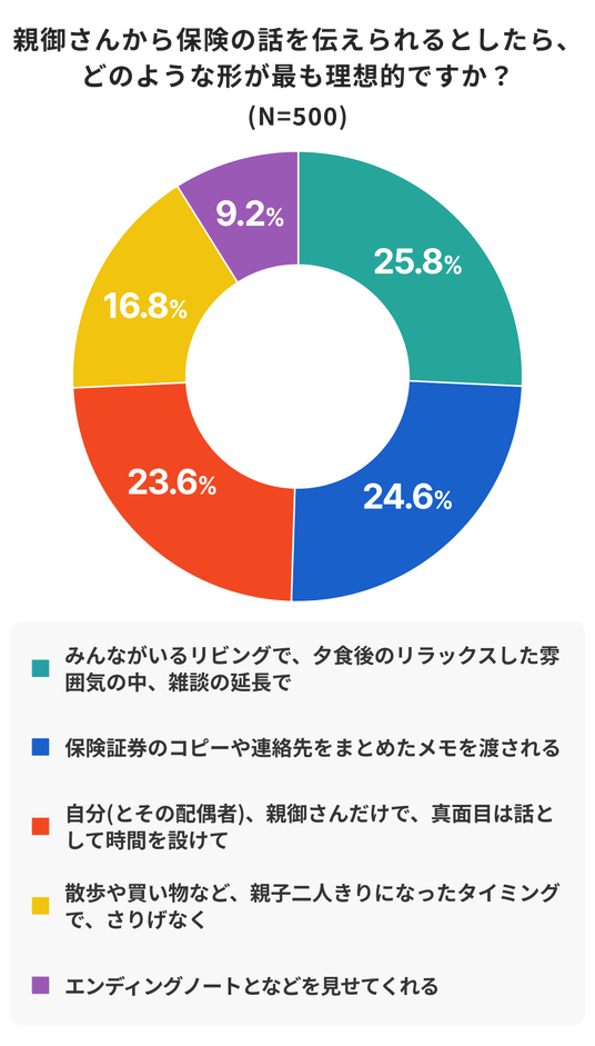理想とする伝えられ方は人によってさまざまであり、「保険について話す完璧なシチュエーション」はなく、「万が一の時、手続きで迷惑をかけたくないから、メモだけ共有してほしい」といったように自分たちの親子関係に合った形で、まずは「共有する」という行動そのものが大切であると考えられます。
