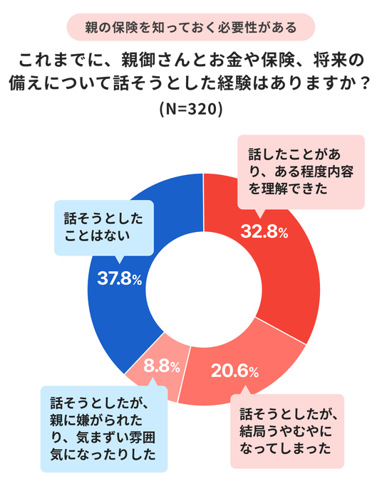 さらに、親の保険を知っておく必要があると回答した人でも「これまでに、親御さんとお金や保険、将来の備えについて話そうとした経験はありますか?」という質問では約4割(37.8%)が「これまで話そうとしたことすらない」という、意識と行動の大きなギャップが浮き彫りになりました。