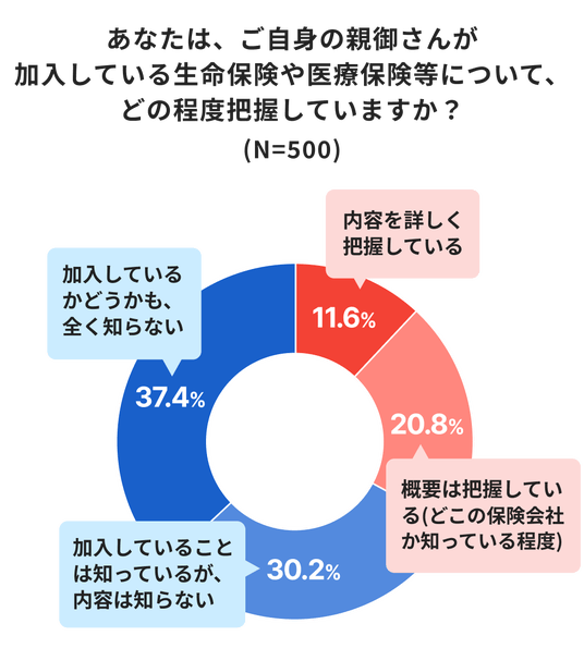 しかし実態は厳しく、「親御さんが加入している生命保険や医療保険等について、どの程度把握していますか?」という質問に対し、3人に2人以上(67.6%)が親の保険内容を「把握していない」と回答しています。