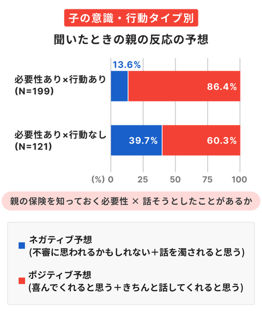 - 話せていない人の理由は、表向きは「多忙」だが、深層には「親の反応への不安」が見てとれる。話そうとしたことのない層は、話そうとした層の約3倍も親に保険の話をすると「不審がられる/話を濁される」と予想。