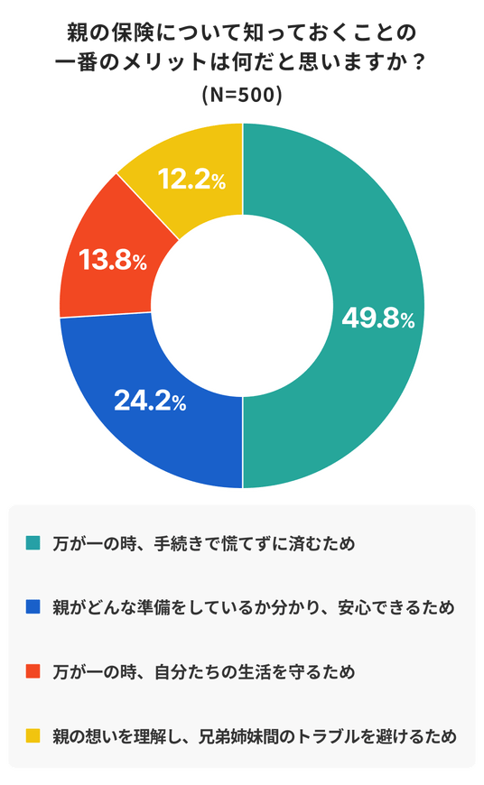 「親の保険について知っておくことの一番のメリットは何だと思いますか?」という質問に対しては、安心感などの情緒的な理由ではなく、「万が一の時、手続き等で慌てずに済むため」(49.8%)という実務的な理由が1位でした。