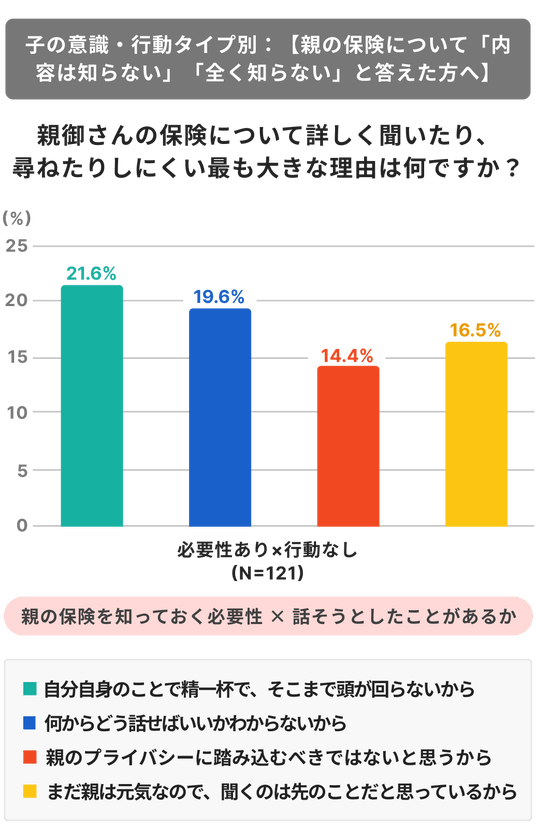親の保険について知ることの「必要性を感じているか」と話そうと「行動したか」で回答者を分類し、必要性を感じつつも話そうとしたことはない層に尋ねにくい理由を聞くと、「自分のことで精一杯(21.6%)」や「何から話せばいいかわからない(19.6%)」といった回答が上位にあがりました。