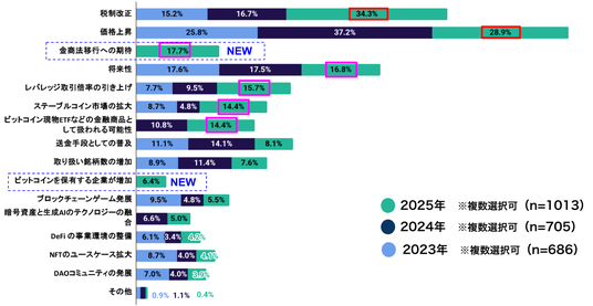 また、新設項目である「金商法移行への期待」17.7%をはじめ、「暗号資産の将来性」16.8%、「レバレッジ取引倍率の引き上げ」15.7%、「ステーブルコイン市場の拡大」14.4%、「ビットコイン現物ETFなどの金融商品として扱われる可能性」14.4%といった回答も上位に入りました。暗号資産は金融商品として議論が進む中で、価格上昇に加えて、税制や制度の見直し、取引環境の整備など幅広い観点で期待が寄せられている結果となりました。