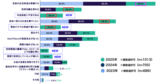 今年は投資理由が多様化しており、「投資知識を深めるため」が32.2%まで上昇したほか、新設項目の「年金制度に不安がある」28.2%や「自由に使えるお金を増やしたい」28.2%も上位に入りました。将来不安への備えに加え、学びや生活余力の確保といった実利的・能動的な動機が広がっていることが示唆されます。